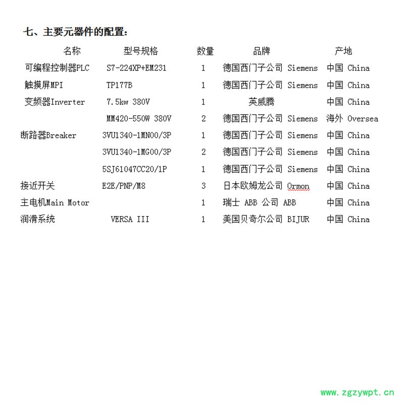 7. 本机的机械和电气元件配置优良,机械部件采用高强度和高钢度的机架机构,特殊加工工艺的转台结构,预压轮和主压轮结构,润滑系统采用美国独资贝奇尔公司的产品,主电机为ABB公司产品,变频器英威腾、显示屏采用西门子产品。
