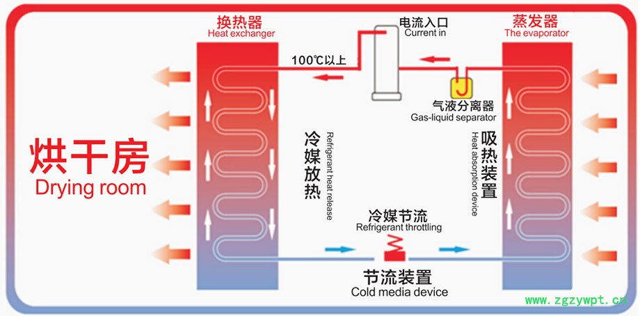 2、高效节能:只需消耗少量的电能**可以在空气中吸收大量的热量,耗电量仅为电加热器的1/4;同燃煤、油、燃气烘干机相比,可节省60%左右的运行费用,1度电等于4度电。