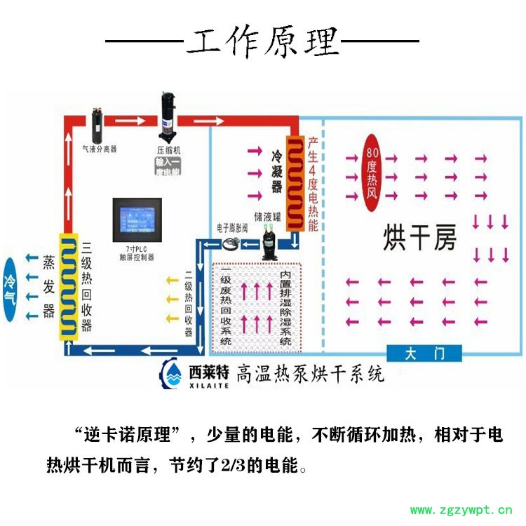 西莱特空气能烘干机是利用“逆卡诺”原理,依靠输入少量的电能并吸收空气中免费的热量且将其转移到烘干房内(故输入1度电能量能产生4度电热能)来实现烘干房的温度提高,配合相应的排湿除湿设备实现物料干燥,由压缩机、冷凝器(加热器)、节流装置(电子膨胀阀)、蒸发器(吸热器)等装置构成了一个制冷循环系统。