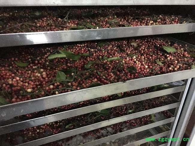 五味子新鲜果采摘后,表面附有尘埃和部分农药残留,干燥前需要清洗处理。将淋洗以后的五味子沥干,然后按照一定的铺料密度远远放入物料盘中进行热风干燥。干制品的水份含量一般在10-15%之间,放置在阴凉干燥处。空气湿度在65%以下,避免阳光直射。烘干时,开始时室温在 60℃左右,当五味子达半干时将温度降到 40℃—50℃,达到 八成干时挪到室外日晒至全干,搓去果柄,挑出黑粒即可入库。五味子烘干机