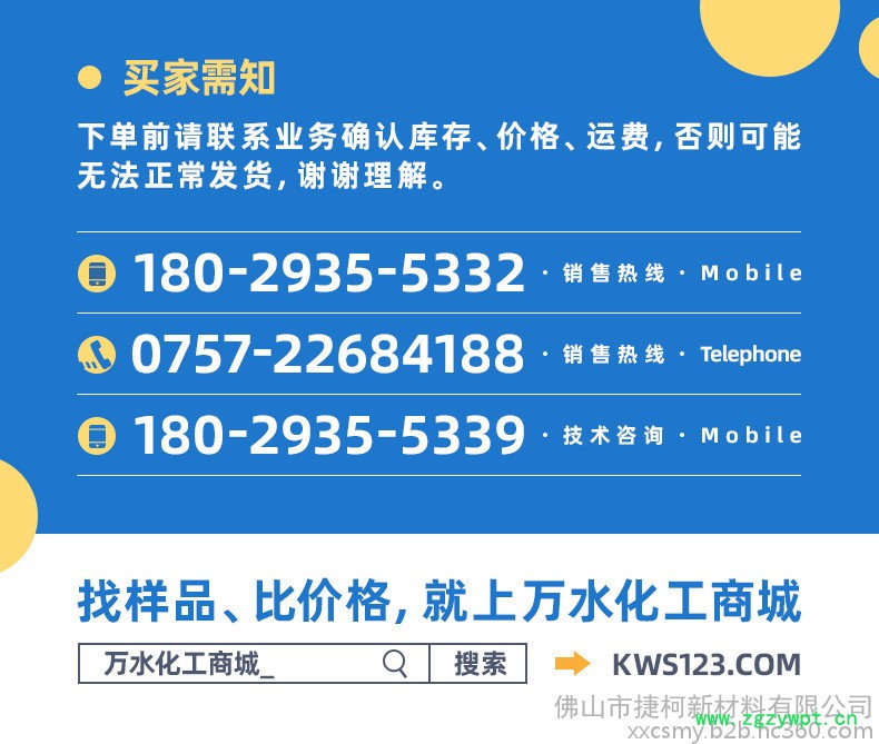 万水化工商城汇聚了马蹄莲、巴斯夫、霍尼韦尔、氰特等众多国内外30多个品牌、50多个品种、2000多个型号,经营产品包括抗氧剂、紫外线吸收剂、光稳定剂、有机颜料、无机颜料、群青、珠光颜料、银粉、银浆、蜡粉、蜡浆、蜡乳液、铜金粉、珠光粉、夜光粉、染料、黑色母、扩散粉、钛白粉、碳黑等上千个产品……