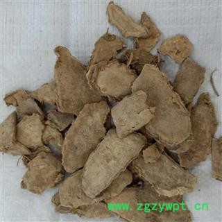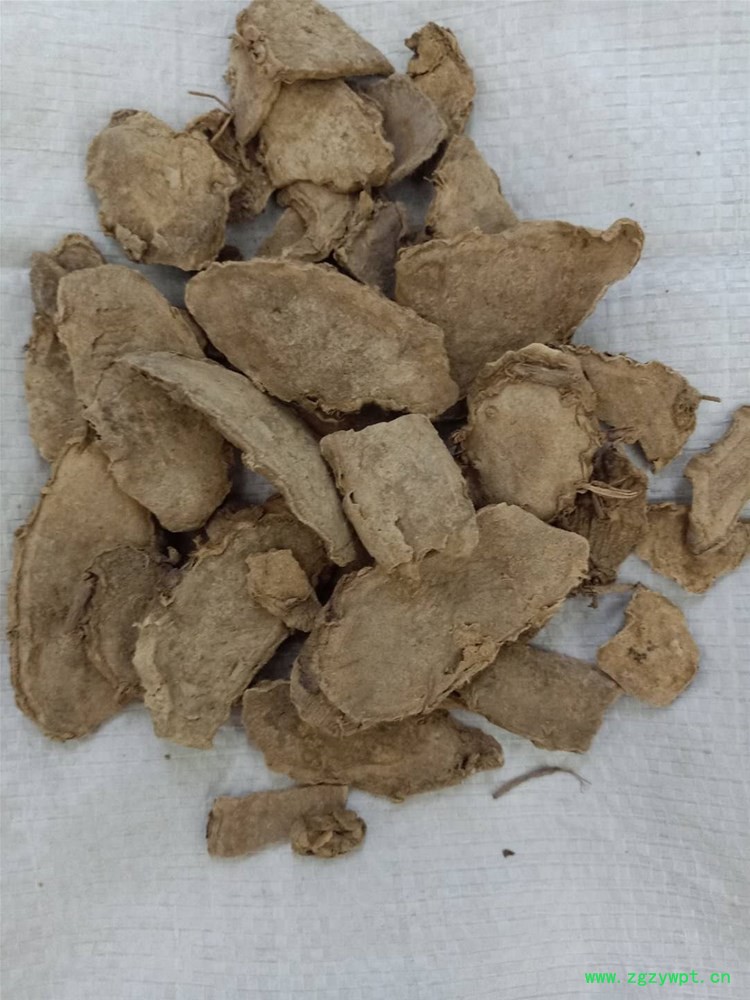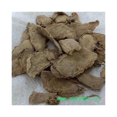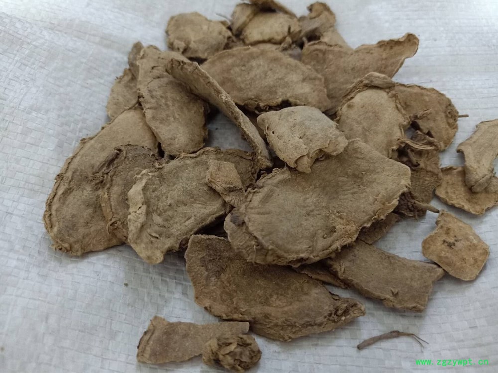 [性 状]:该品呈长圆形或不规则的片状,大小不一,长3~6cm,宽1~3cm,厚片姜黄0.1~0.4cm。外皮灰黄色,粗糙皱缩,有时可见环节及须根痕。切面黄白色至棕黄色,有一圈环纹及多数筋脉小点。质脆而坚实。断面灰白色至棕黄色,略粉质。气香特异,味微苦而辛凉。