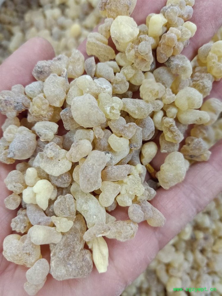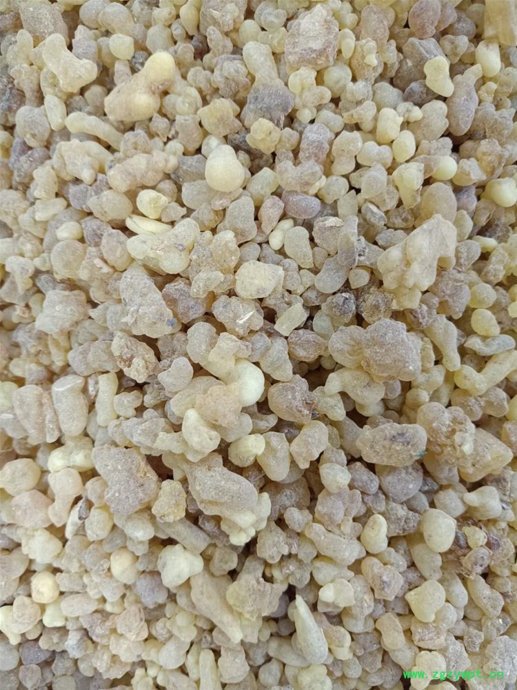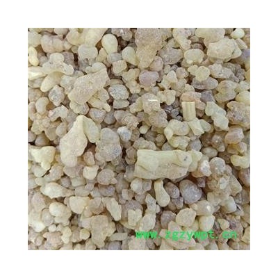【性状颜色】:干燥胶树脂,多呈小形乳头状、泪滴状颗粒或不规则的小块,长0.5~3厘米,有时粘连成团块。淡黄色,常带轻微的绿色、蓝色或棕红色。半透明。表面有一层类白色粉尘,除去粉尘后,表面仍无光泽。质坚脆,断面蜡样,无光泽,亦有少数呈玻璃样光泽。气微芳香,味微苦。嚼之,初破碎成小块,迅即软化成胶块,粘附牙齿,唾液成为乳状,并微有香辣感。遇热则变软,烧之微有香气(但不应有松香气),冒黑烟,并遗留黑色残渣。与少量水共研,能形成白色乳状液。以淡黄色、颗粒状、半透明、无砂石树皮杂质、粉末粘手、气芳香者为佳。特质:无色或淡黄色,有树脂的香气 。