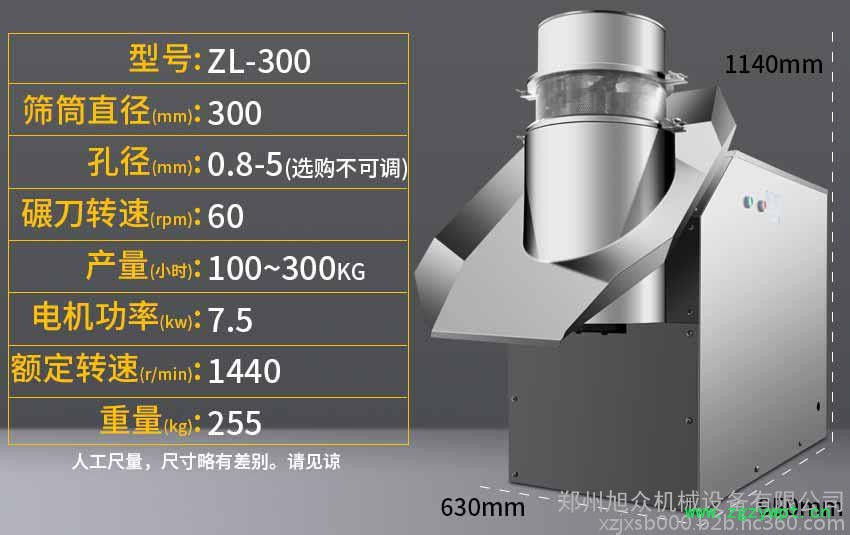 旭朗机械生产的ZL-300旋转式制粒机与物料接触部位全部都采用不锈钢制成,适用于制药、食品、化工、轻工等行业,将潮湿的粉末碾成所需的颗粒,亦可用于将已压成块状的干粉粉成颗粒,本机操作简单,维修方便,清洗容易,自动出料,并可根据用户需要选择不同孔径的筛筒,与物料接触部位均采用不锈钢材料制成,能确保物料的本色而不变质。