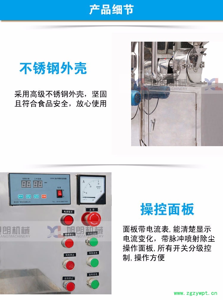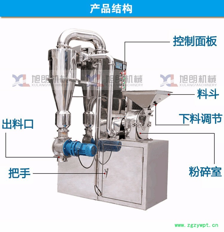 旭朗SZFJ系列中草药粉碎机组由加料斗,分级轮,粉碎刀片,齿圈,粉碎电机,出料口,风叶,集料箱,吸尘箱等部分组成,物料由加料斗进入粉碎室,通过高速旋转的刀片进行粉碎,调节分级轮与分级盘的距离来达到所要求的物料细度,高速旋转的风叶把达到要求的物料从粉碎室引到集料箱布袋中,没有达到要求的物料继续在粉碎室中粉碎,集料箱布袋产生的粉尘由吸尘箱收集。广州旭朗SZFJ系列中草药粉碎机组按“GMP”标准设计,结构简单,操作清理方便,噪音小,产量高,机器全部用不锈钢材料制造,粉碎过程中无粉尘飞扬。