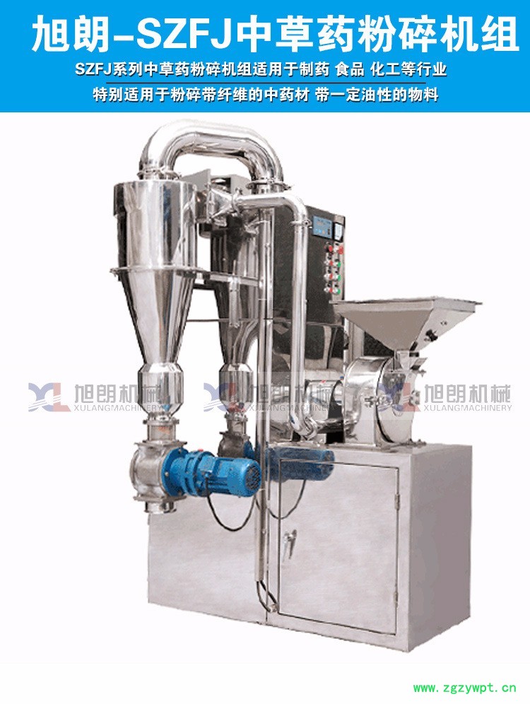 旭朗SZFJ系列中草药粉碎机组适用于制药、食品、化工等行业。具有风冷、无筛网等多种性能,它不受物料粘度、软硬度及纤维等限制,对任何物料能起到较好的粉碎效果。特别适用于粉碎带纤维的中药材、带一定油性的物料。