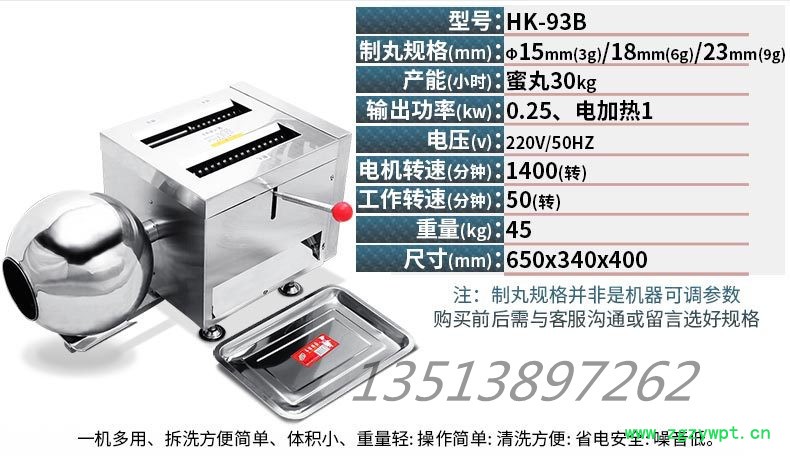 制丸机分小丸机HK-93A型号和大丸机HK-93B型号二种,机器只是大小不一样,其它都一样。小丸机有3.4.5.6.8.10.12毫米直径的规格,大丸机分3克(16mm).6克(19mm).9克(23mm)三种规格。一台机器装一副模具。一副模具只能做一种规格的药丸,可以更换模具调节药丸大小,另购模具费用另加。(小丸机可以更换小丸模具调节大小;大丸机可以更换大丸模具调节大小。因为模具尺寸不一样不能混搭)