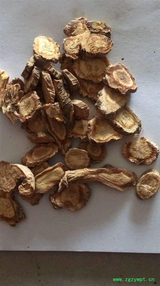 【药材性状】圆形或长圆形厚片外表面灰棕色 切面皮部浅棕色 木部浅黄色 有明显裂隙和细小油点 体轻质松 其特异味微苦