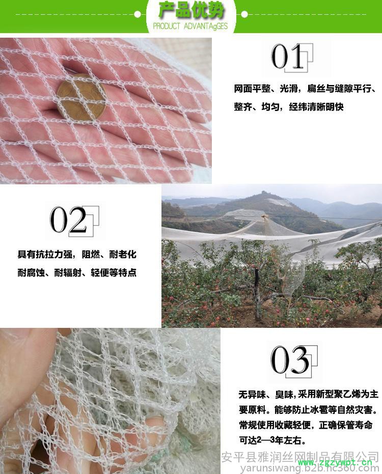 对雹网材料要求:①重量要轻,便于架设;②耐用;③价格便宜;④对光照影响小。