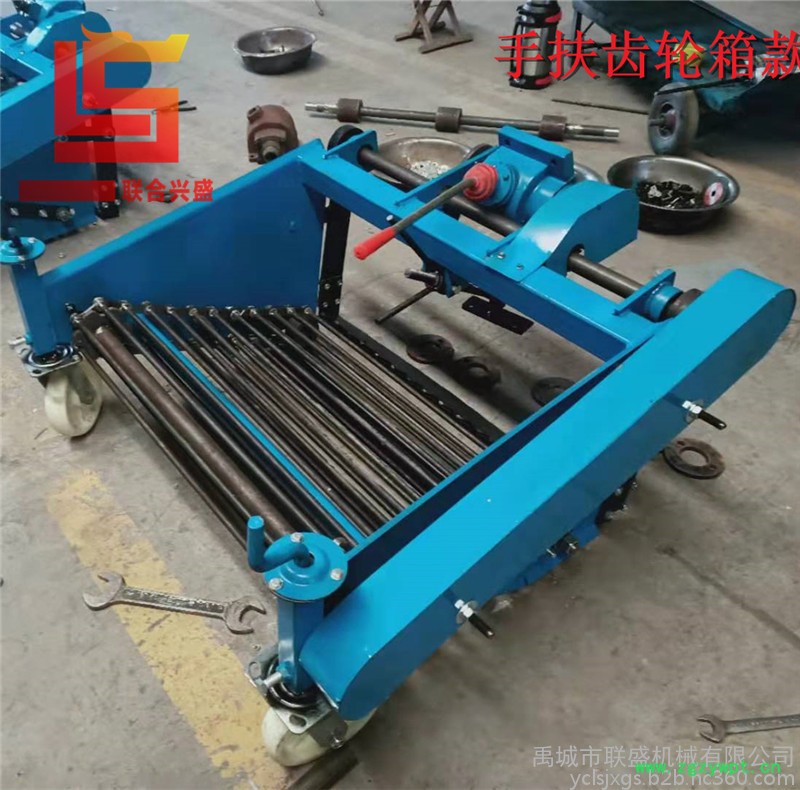 4U系列马铃薯收获机通过后齿轮或侧链轮传动方式配套于12-18HP拖拉机。该土豆收获机用于薯类挖掘,将块茎部分从土壤中分离,从而使薯类脱离根茎到达地面便于拾捡。该工作原理是在拖拉机齿轮传动下,通过振动筛震动使土壤和块茎分离,土壤在振动筛间隙掉落,留在振动筛上的马铃薯则通过振动筛的震动落在后面土地上。