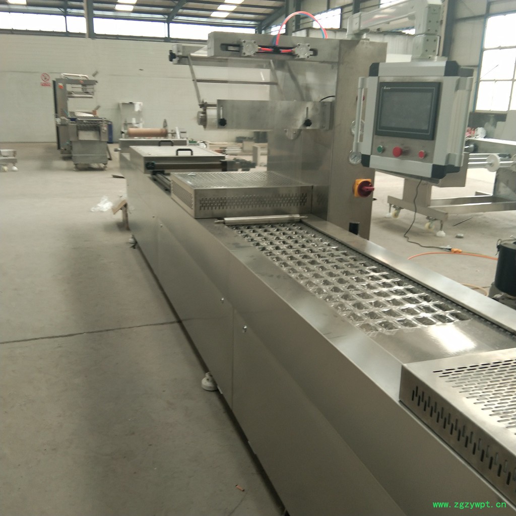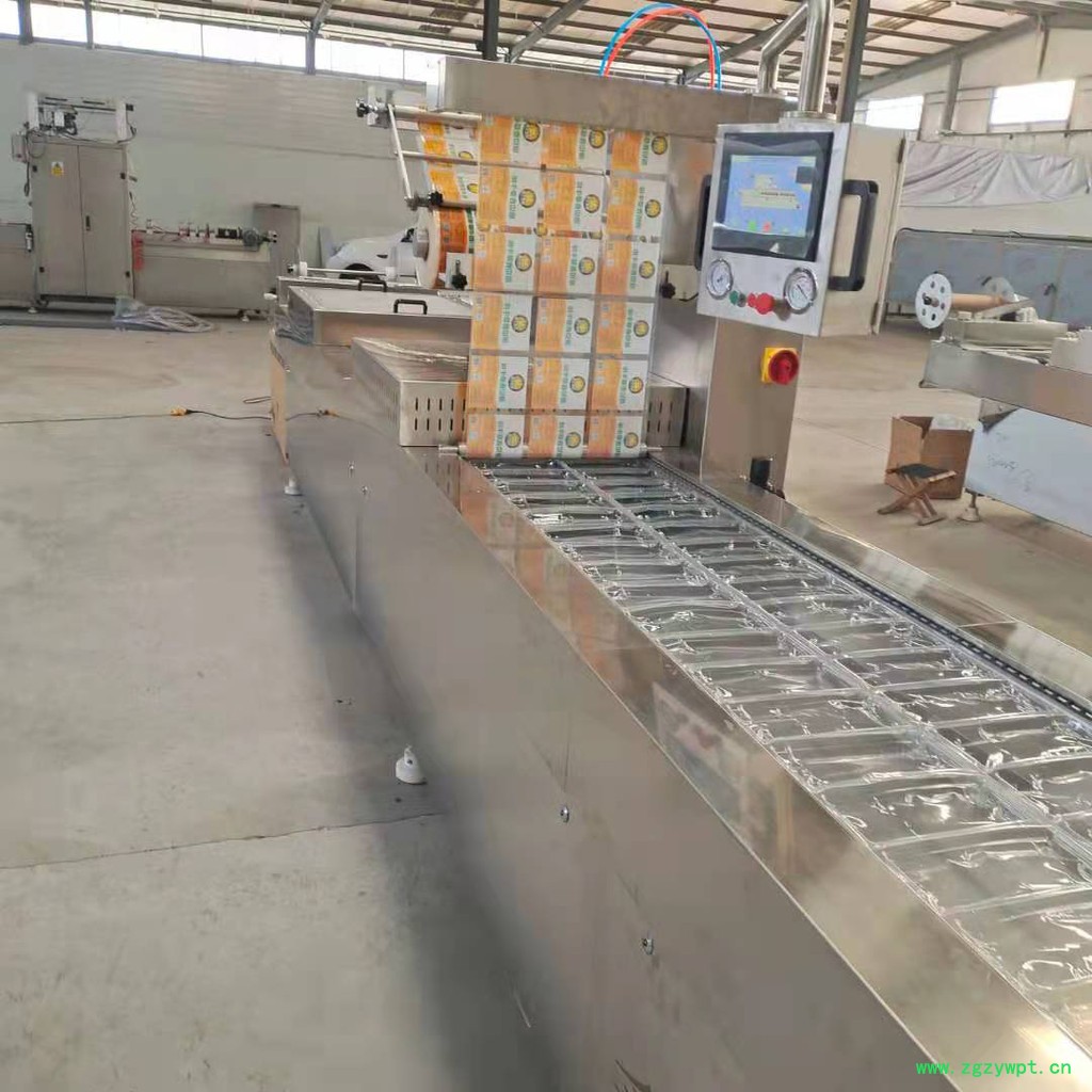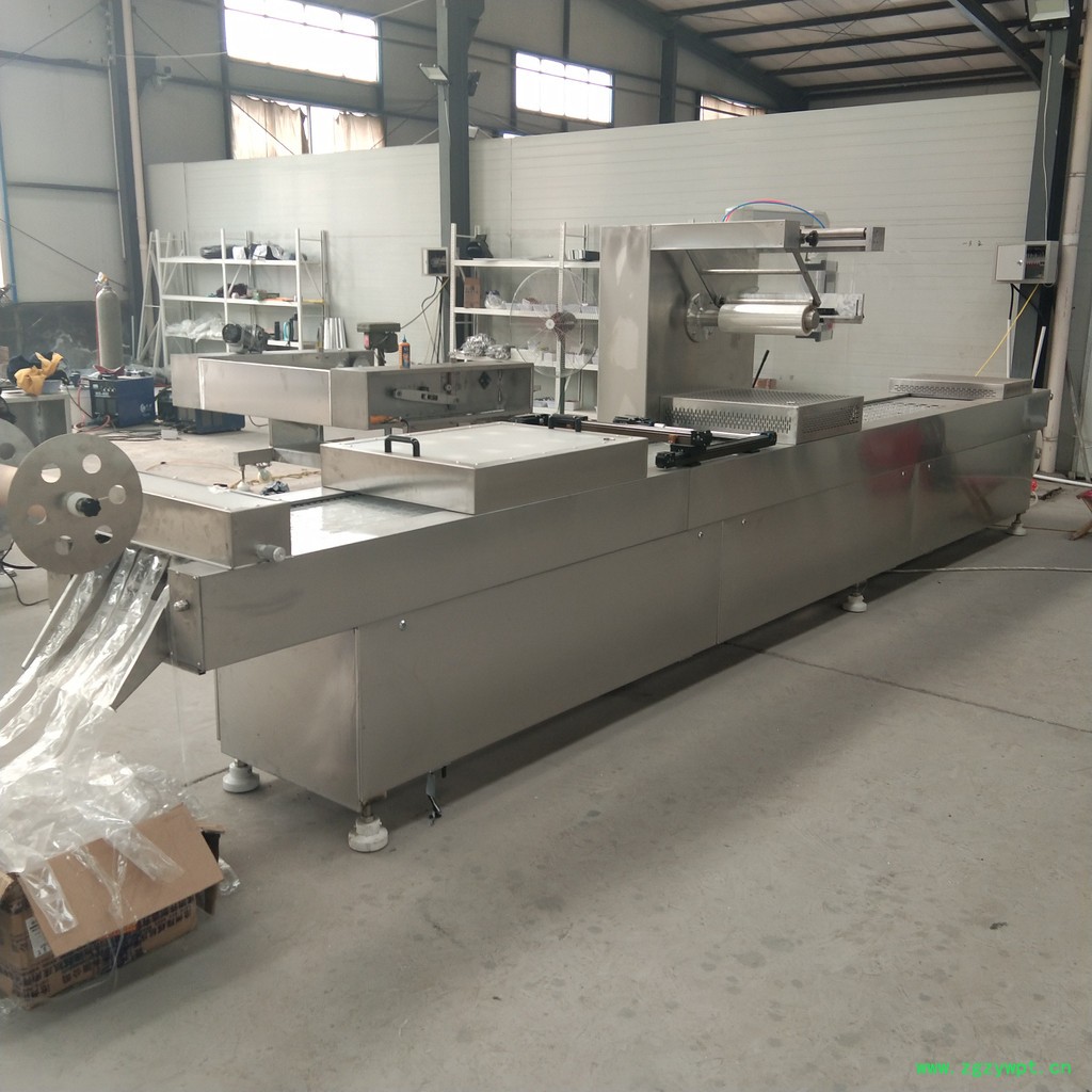 1、整机集薄膜拉伸成型、装填物料、抽真空、充气、热封、打码/喷码、分切等于一体在一台设备上实现,一台设备相当于一条生产流水线。