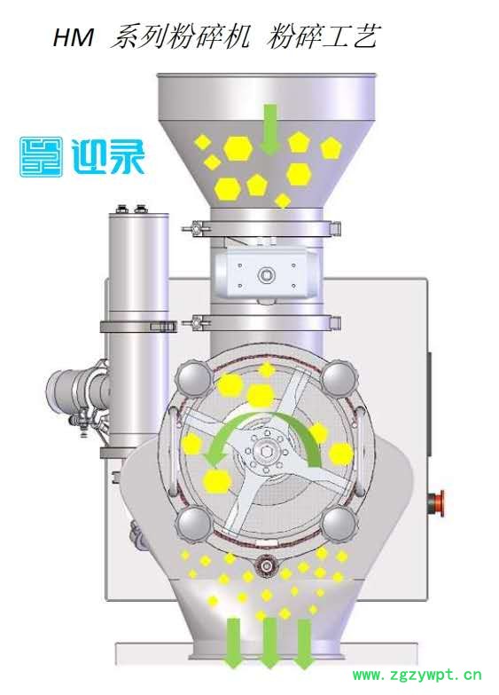 粉碎机头由一张筛网,一个转子和一个喂料器组成。物料通过喂料器均匀进入粉碎腔内,经过转子的高速撞击粉碎通过筛网过筛后成为需要的粒径成品。