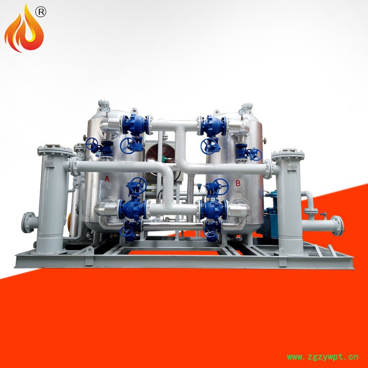 天然气脱水装置+天然气干燥器+CNG脱水装置+天然气干燥机 YNG系列天然气脱水装置,天然气干燥器,放置于加气站的压缩机前,对天然气中的微量水分进行深度脱除,使得天然气在压缩过程及储存环节中不会产生凝析水,天然气脱水装置保障压缩机的正常运行和天然气在存储、运输及使用过程的安全。 天然气脱水装置采用整体撬装式,双塔结构,一塔吸附,另一塔再生。天然气脱水装置吸附饱和时两塔自动切换,双塔交替进行,实现不间断地脱水。装置塔径相对小,床层高,分子筛装填量大。水分吸附量大,吸附周期长,脱水深度低,可连续工作运行,不间断输出低于-50℃~-70℃纯净、干燥气体。 天然气脱水装置核心技术Ⅰ. 天然气脱水装置独特的塔体内结构设计,不仅保证分子筛的压紧,而且使塔体内所有分子筛均处于工作状态,充分提高分子筛的利用率,延长吸附时间,降低切换频率,提高设备使用寿命。 Ⅱ. 天然气脱水装置再生方式选用闭式等压循环,实现再生气的零排放,避免气源浪费,更环保。 Ⅲ. 天然气脱水装置吸附-再生过程人工切换,其它全自动控制和显示,并可通过上位系统进行实时数据的远程显示和控制。