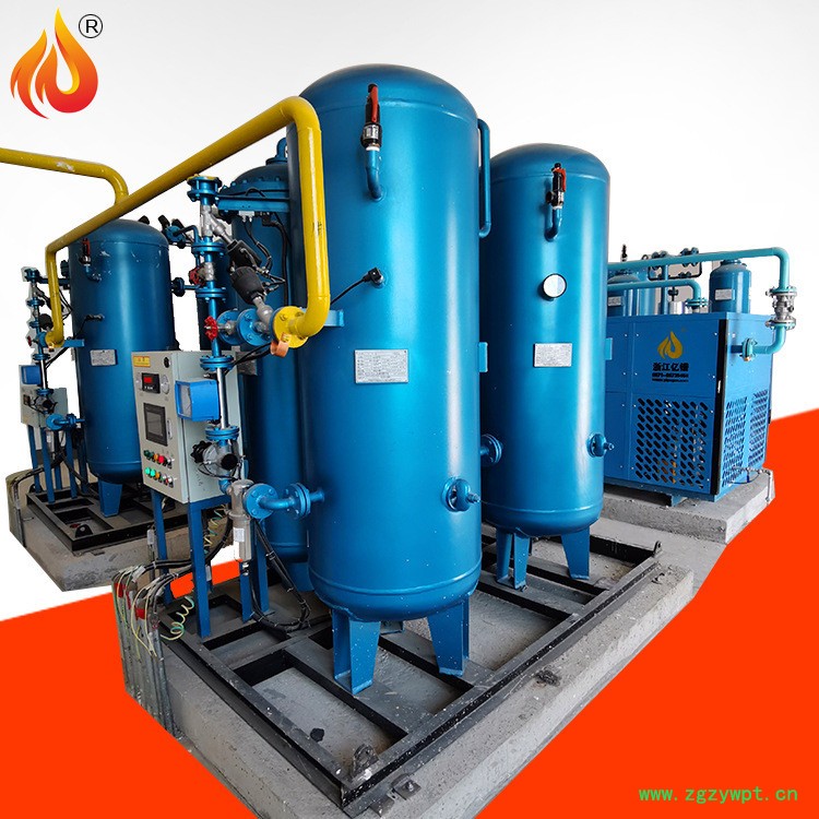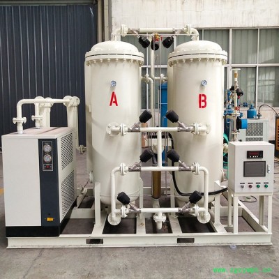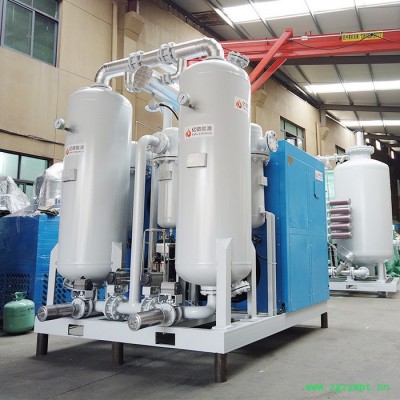 1.制氮机工作原理变压吸附制氮机是根据其吸附剂(碳分子筛)在不同压力下吸附能力变化来获取氮气的设备。在一定压力下,空气通过分筛床层时,其中氧在碳分子筛表面的扩散速率远大于氮,从而使得氧分子被碳分子筛吸附,而氮分子得以集聚。设备通过可编程控制器一定时序控制各个阀门启闭,达到A、B两塔加压吸附而减压脱附的循环交替,完成氧氮分离,得到所需纯度的氮气。 2.制氮机装置性能特点1)制氮机独特的吸附塔结构和工艺,避免吸附剂浮动、粉化,易于大型化。2)制氮机独特的内部构件,气流分布均匀,减轻高压气流对碳分子筛的冲击3)制氮机操作简便,运行稳定,自动化程度高,可实现全自动运行。4)制氮机自动联锁氮气排空装置,保证产品氮气质量。5)制氮机可选配氮气装置流量,纯度自动调节系统,远程监控系统等。 3.制氮机技术指标1)氮气流量:5-5000NM3/h2)氮气纯度:95-99.999%3)氮气压力:0.05~1.0Mpa可调4)露点-40℃~-70℃