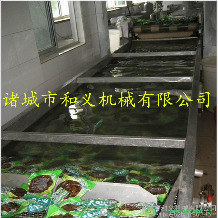 该杀菌流水线分杀菌和冷却两部分,通过链条的不断运转,带动被杀菌物进入槽内连续作业,适用于酱菜、腌渍菜、低温肉制品、果汁、果冻、酸奶及各类饮料的自动化连续巴氏杀菌,也可用于蔬菜的漂烫、杀青处理。