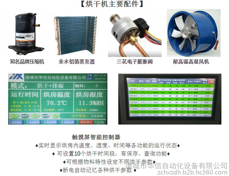 主要蒸发器 (外机)、压缩机、翅片冷凝器 (内机)和膨胀阀四部分组成,通过此口质不断完成蒸发( 吸取室外环境中的热量)压缩一冷凝(在室内烘干房中放出热育)节流一再蒸发的热力循环过程 ,从而将外部低温环境里的热量转移到烘干房中,冷媒在压缩机的作用下在系统内循环流动。它在压缩机内完成气态的升压升温过程(温度高达100C),它进入内机释放出高温热量加热烘干房内空气,同时自己被冷却并转化为流液状当它运行到外机后,液态迅速吸热蒸发再次转化为气态,同时温度可下降至20--30C这是吸热器周边的空气**会源源不断地将热量传递给冷媒。