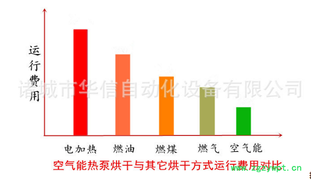 热泵烘干机是一种新型高效节能干燥机,其工作原理是根据逆卡诺循环原理,采用少量的电能,利用压缩机,将工质经过膨胀阀后在蒸发器内蒸发为气态,并大量吸收空气中的热能,气态的工质被压缩机压缩成为高温、高压的气体,然后进入冷凝器放热,把干燥介质加热,如此不断循环加热,可以把干燥介质加热至40℃~80℃。相对于电热干燥机而言,节约了三分之二的电能。