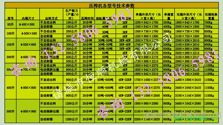 3、结构简单、坚固耐用、维修方便、压力大、生产效率高根据用户需求定制单、双桶轮换式压榨;