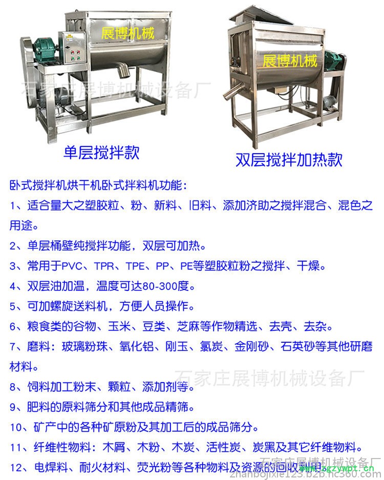 卧式搅拌机产品特点:1、料桶及桨叶全不锈钢制造,清洗容易、避免锈蚀。2、摆线针轮减速机,寿命长,噪音低。3、防护门特殊设计,易于设备保养、维护,特配人梯,投料更方便。4、双向S形螺旋桨叶,拌料迅速、均匀。5、顶部可视窗口,易于观察混料情况。6、计时器0-60分钟任意定时混料。7、可订做加热型或冷却型。