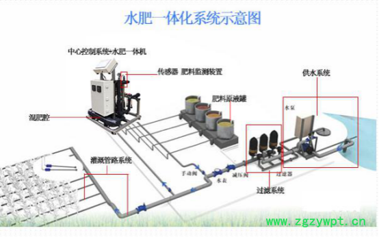 水肥一体化借助压力系统,将液体肥或农药,按土壤养分含量和作物种类的需求规律和特点,配兑成的肥液或药液,与灌溉水一起,通过一体机控制系统供肥水或供药水,使肥水或药水相融后,通过一体机连接管道和喷滴头形成喷滴灌、均匀、定时、定量,浸润作物根系发育生长区域,使主要根系土壤始终保持疏松和适宜的含水量,同时根据不同的蔬菜的需肥需药特点,根据土壤环境和养分含量状况,根据蔬菜不同生长期需水需肥需药规律情况,进行不同的需求设计,把水分、养分和农药定时定量,按比例直接提供给作物。
