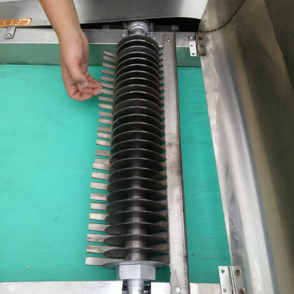 先转动可调偏心轮,使刀架行至下死点后,再使刀架向上抬起1/2毫米,使竖刀与输送带接触后,紧固螺母把竖刀紧固在刀架上。说明:刀架抬起高度可根据所切蔬菜自行掌握。如果高架抬起高度小,蔬菜有可能连刀,如果高架抬起高度过大,有可能切坏输送带。