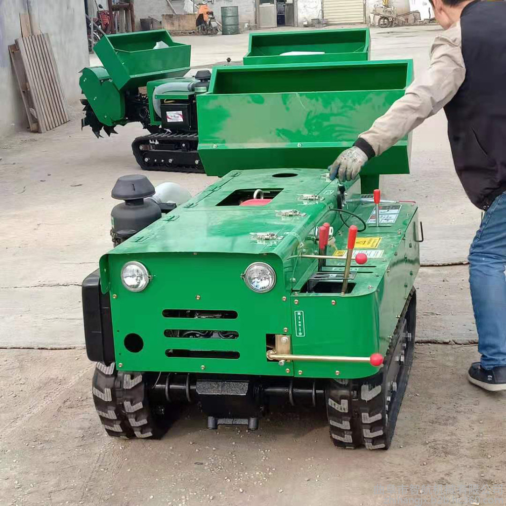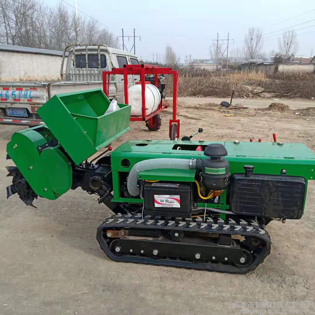 该机动力采用35马力单缸柴油机,发动机为中置,行走变速箱和传动变速箱分开,在丘陵地区开沟施肥作业时不用外加配重,箱内全部为齿轮传动,结实耐用。行走采用橡胶履带,行走直线性和通过性好,与地面接触面积大,不易打滑。开沟刀采用65锰钢自制,刀刃全部用耐磨焊条加强焊制,比普通开沟刀结实耐用至少10倍;采用蛟龙式强制排肥,下肥量可调,每米0.5~15斤,并且干的小块牛羊粪可通过施肥自动回填装置直接施肥,大块农家肥可通过单独开沟进行施肥;本机主要有六大功能:开沟施肥自动回填一次性完成(化肥)、单独开沟施土杂肥、单独除草、更换回填和旋耕装置后可进行回填和旋耕作业,更换风扇可以进行喷雾式打药功能(客户自选);该机体积小,重心低,操作灵便,可原地转向,适用于果园葡萄、果树、枸杞、蓝莓等经济作物的开沟施肥作业。