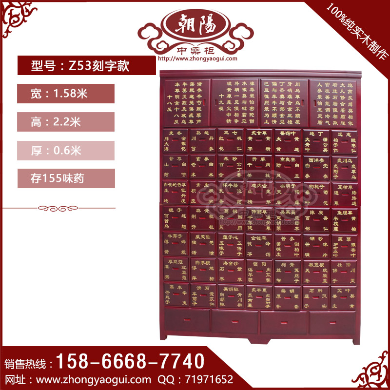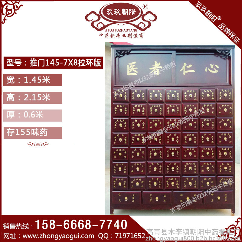 高青县木李镇朝阳中药橱柜厂(注册商标:玖玖朝阳) 专业生产各种中药橱,中药柜,中药斗,中药架,中草药柜,中药饮片柜,中药柜台,中医药柜,中药斗柜,中药调剂台,中药操作台等,古色古香的风格融入现代制作工艺,经久耐用、不变形、不走样、防虫蛀、防腐蚀、防潮湿。采用榫卯结构,中间布局合理,不串味、不污染,先进的防鼠设计,安全卫生,健康环保聚酯漆喷涂八遍,明亮、高雅。致力于打造中药橱柜良心品牌!