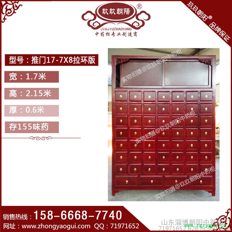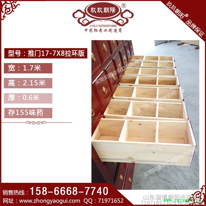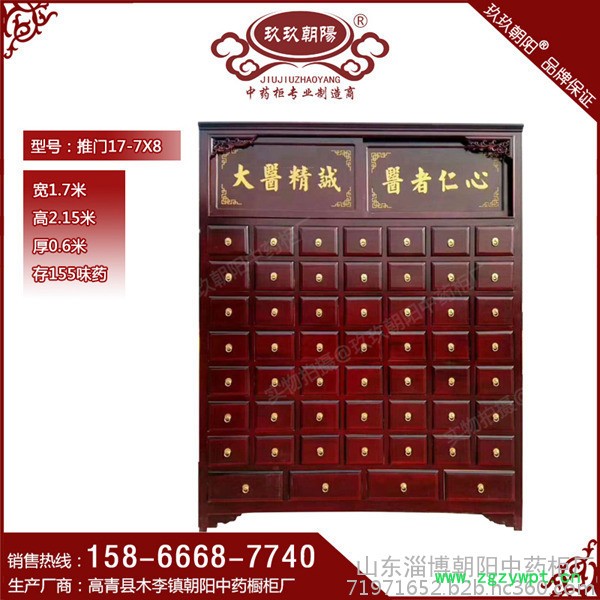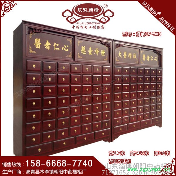 高青县木李镇朝阳中药橱柜厂(注册商标:玖玖朝阳) 专业生产各种中药橱,中药柜,中药斗,中药架,中草药柜,中药饮片柜,中药柜台,中医药柜,中药斗柜,中药调剂台,中药操作台等,古色古香的风格融入现代制作工艺,经久耐用、不变形、不走样、防虫蛀、防腐蚀、防潮湿。采用榫卯结构,中间布局合理,不串味、不污染,先进的防鼠设计,安全卫生,健康环保聚酯漆喷涂八遍,明亮、高雅。致力于打造中药橱柜良心品牌!