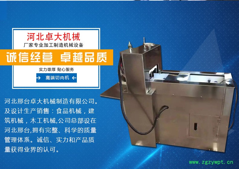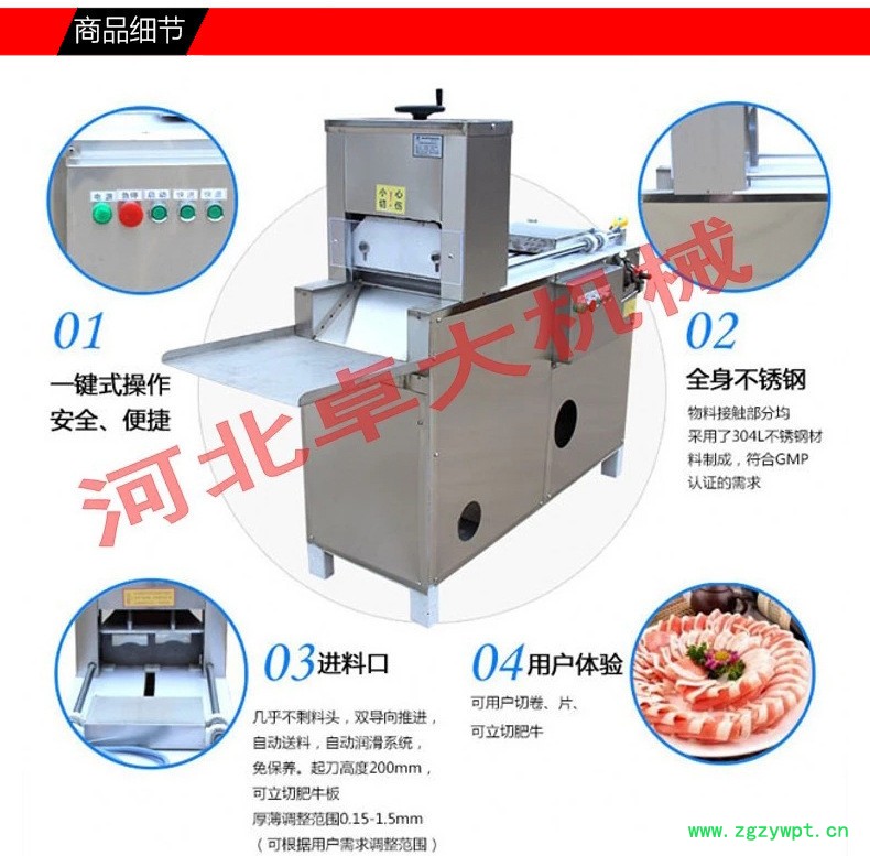 适合大中小型肉片加工企业使用。本产品多项功能均为**,采用电动推料、电动压料、电动调节厚薄、步进式推料、肉料加工完毕切刀自动停止,推料板自动后退,自动停止、切刀开启传送带自动同步运转、防护门开启整机自动断电,自动化程度高,肉片切制,厚薄调节,肉卷输送,自动停机,均可一键完成省工省时。多功能羊肉切片机,牛羊肉切片机,大型冻羊肉切片机,小型羊肉切片机,数控冻羊肉切片机,羊肉刨卷机,阿胶切片机。