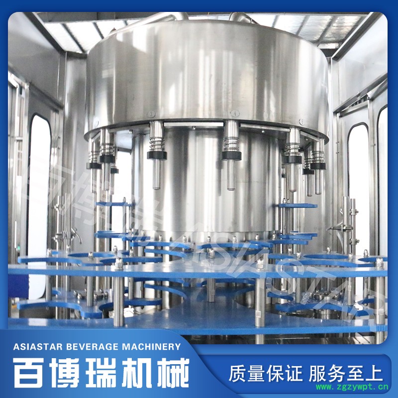 灌装采用压力灌装方式。灌装阀下降接触瓶口后打开完成灌装过程,灌装结束后灌装阀上升离开瓶口,瓶子通过卡瓶颈过渡拨轮进入旋盖机。