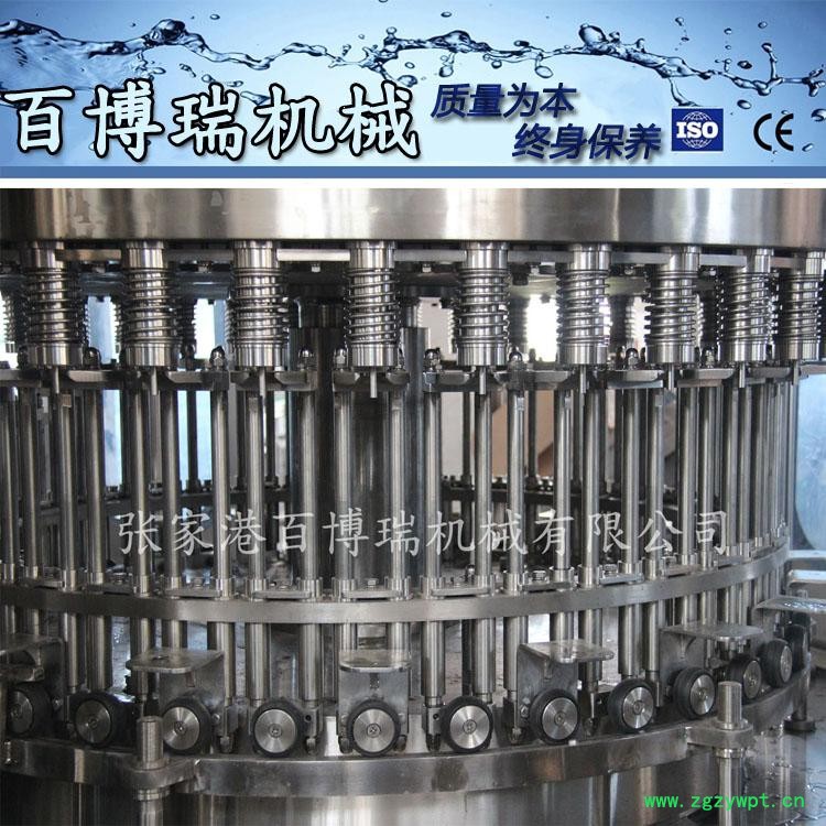 该机的生产过程如下:瓶子通过风道传送至三合一灌装机。冲瓶机的回转盘上装有瓶夹,瓶夹夹住瓶口沿一导轨翻转180°,使瓶口向下进入冲瓶机。在冲瓶机的特定区域,特制喷嘴喷出冲瓶水,对瓶子内壁进行冲洗。瓶子经冲洗、沥干后在瓶夹夹持下沿导轨再翻转180°,使瓶口向上。洗净后的瓶子通过拨瓶星轮由冲瓶机导出并传送至灌装机。进入灌装机的瓶子由瓶颈托板卡住瓶口保持,通过升降机机构在凸轮作用下实现下降下与上升。灌装采用重力灌装方式,瓶口上升顶开灌装阀完成灌装过程。灌装结束后瓶口下降离开灌装阀。瓶子通过卡瓶颈过渡拨轮进入旋盖机。旋盖机上的止旋刀卡住瓶颈部位,保持瓶子直立瓶防止旋转。旋盖头在旋盖机上保持公转并自转,在凸轮作用下实现抓盖、套盖、旋盖、脱盖动作,完成整个封盖的过程。成品瓶通过出瓶拨轮从旋盖机传送到出瓶输送链上,由输送链传送出三合一瓶装机。整机设备采用封闭,封窗高度高于设备**高点,进、出瓶处留有适当的通道,封窗底部留有排风槽。