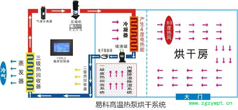 易科空气能烘干机是利用“逆卡诺”原理,依靠输入少量的电能并吸收空气中免费的热量且将其转移到烘干房内(故输入1度电能量能产生4度电热能)来实现烘干房的温度提高,配合相应的排湿除湿设备实现物料干燥。其由压缩机、冷凝器(加热器)、节流装置(电子膨胀阀)、蒸发器(吸热器)等装置构成了一个制冷循环系统。