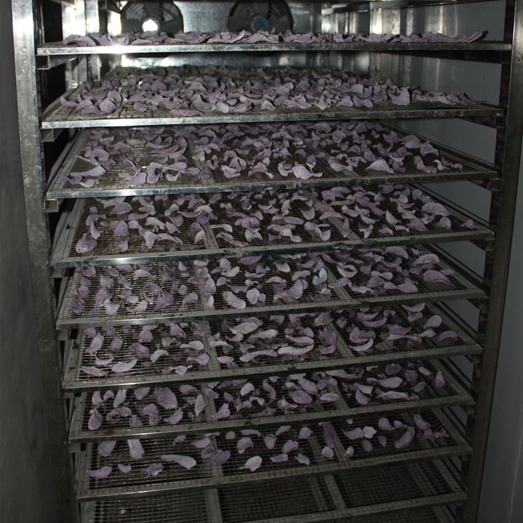 1、山药清洗、去皮、切片:将需要烘干的山药清洗去皮后,切成厚薄均匀、大小一致的山药片,过水处理,沥干水分后就铺放到不锈钢的物料车架上,注意不要起堆,片与片之间要留有一定的间隙。根据不同的烘干要求,设置好铺料厚度、烘干速度、温度等参数,开始进行山药的烘干工作。