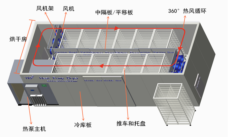 2、烘干房:主要是用来摆放要烘干的物料,采用10cm聚氨酯保温板,填充密度40公斤,保温效果更好,同时也可以避免热量的流失;