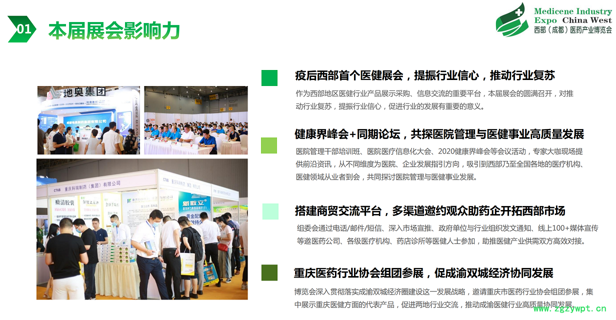成都医药产业博览会-成都药交会依托四川地区作为四大产药区之一及第一个国家中药现代化科技产业基地的优势,同时利用成都作为西部地区的政治、经济、文化、金融中心、通讯和交通枢纽等便利条件,专注于搭建西部地区医药行业全产业链交流、采购平台,推动产业升级,促进四川的中医药、民族医药现代化的发展,实现中医药产业链之间的高效对接。成都医药产业博览会-成都药交会获得成都市卫健委、经信局、民政局、博览局及市场监督管理局等单位的大力支持,并已成为成都市政府重点扶植品牌展会。