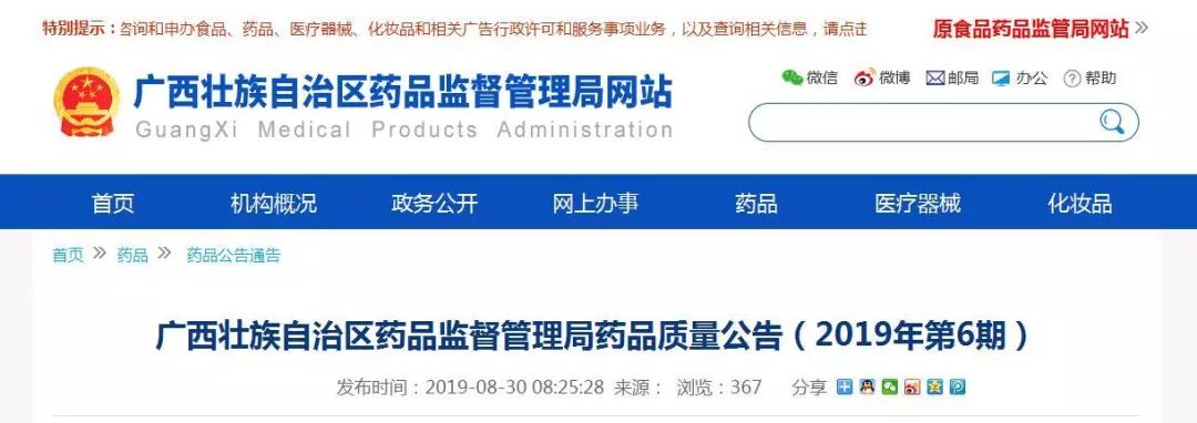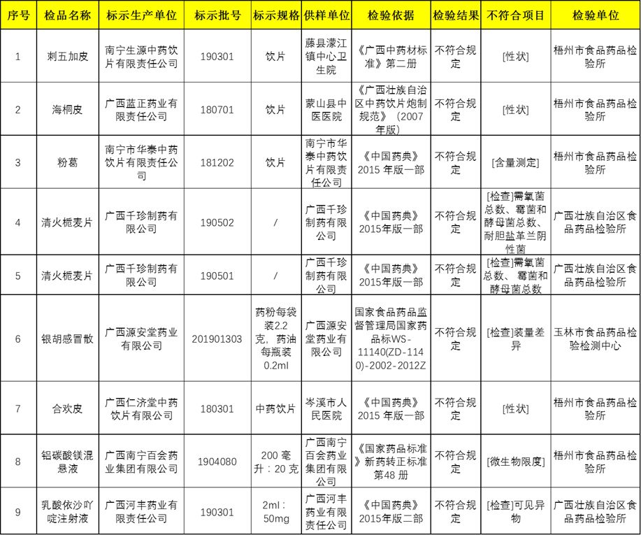 8月30日,广西壮族自治区药品监管局公布2019年第6期药品质量公告。