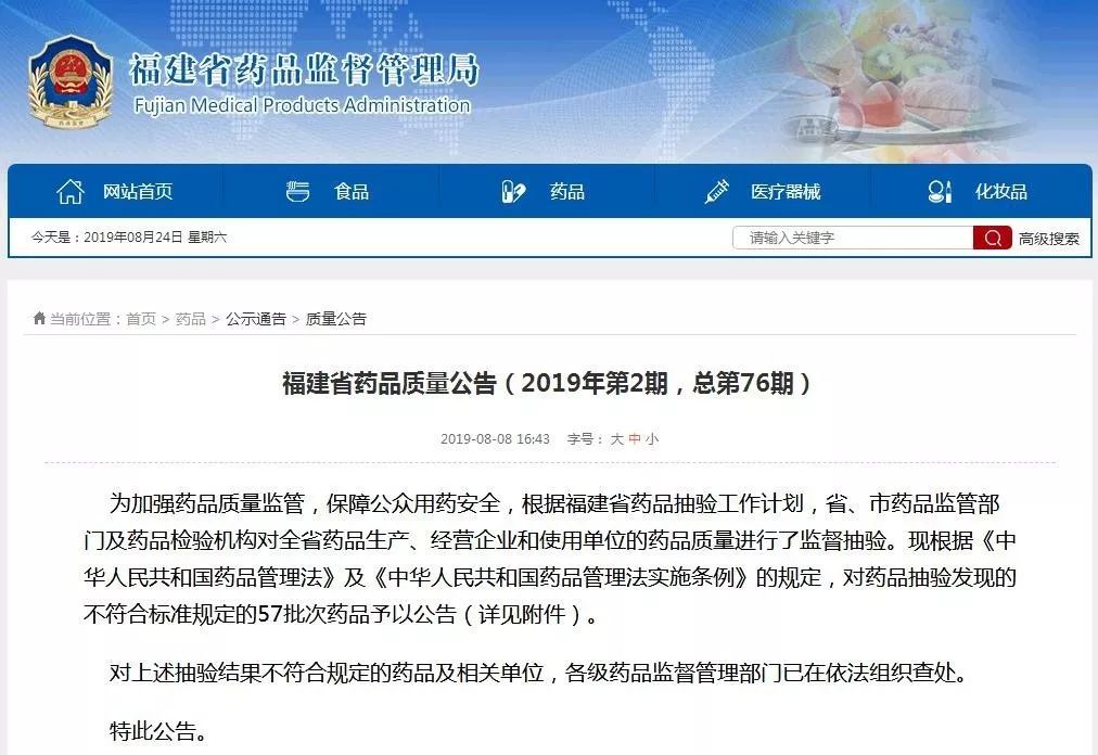 近日,福建省药品监督管理局网站公布2019年第二期福建省药品质量公告,共有57批次不符合规定药品,其中56批次为中药饮片,1批次复方制剂。具体公告内容如下: