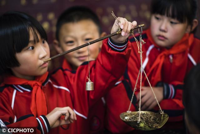 ↑2021年10月18日,河北省邢台市柏乡县南马中心小学学生在中药店学习用戥子称药。CICPHOTO/栗剑兵 摄