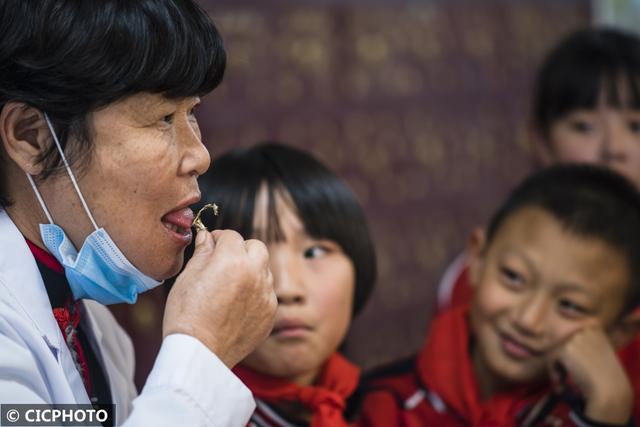 ↑2021年10月18日,河北省邢台市柏乡县南马中心小学学生在中药店了解中药及其功效。CICPHOTO/栗剑兵 摄
