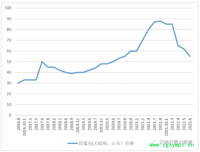 玫瑰花此轮高价出现在2021年前后。2020年产新伊始,玫瑰花价格便呈现稳中趋升的态势,人气逐渐走高,关注商家较多,市场山东统货售价在60-62元之间,甘肃货售价在70元上下,随着国内疫情控制较好,批发商加大存货,价格逐渐上扬到90元高位。