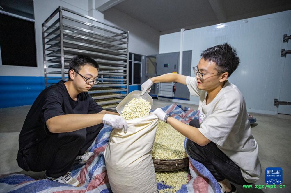 7月14日,在重庆市巫溪县兰英乡西安村,村民将烘干好的贝母装袋。