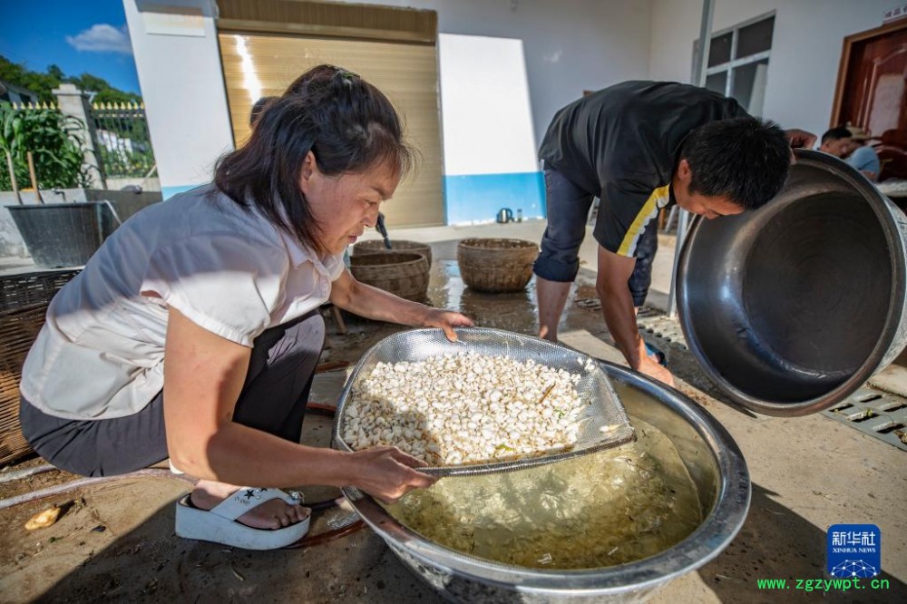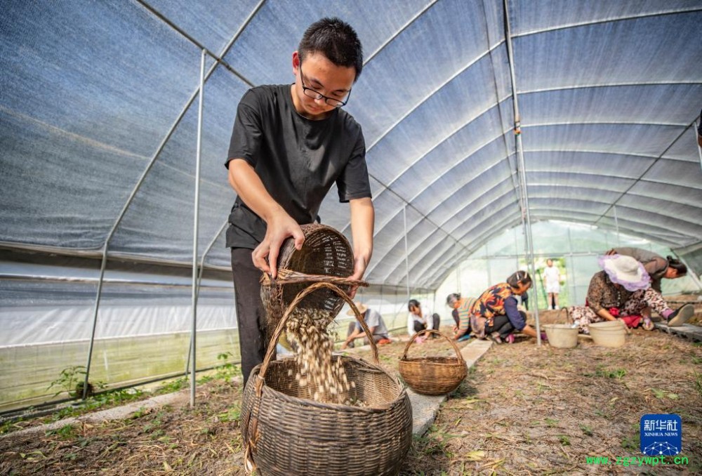 7月14日,在重庆市巫溪县兰英乡西安村,村民将贝母倒入烘干托盘。