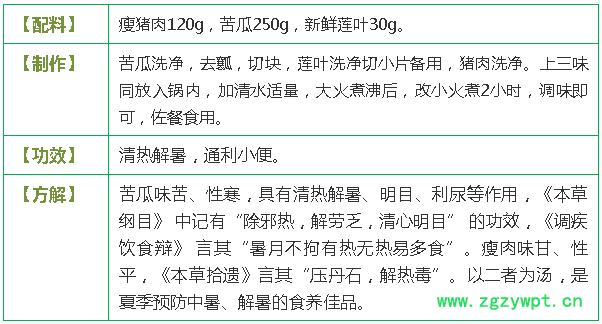 (4)苦瓜:有清火消暑,明目解暑的作用,适宜夏季烦热、口渴多饮,甚者中暑发热时服食。