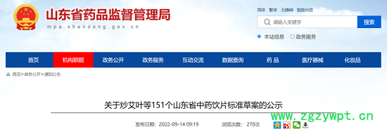 根据《山东省中药材标准》《山东省中药饮片炮制规范》制修订工作安排,我局已组织完成炒艾叶等64个山东省中药饮片标准修订及醋艾叶等87个新中药饮片标准拟定工作,为确保标准的科学性、合理性和适用性,现将拟制修订的151个中药饮片标准草案公开征求意见,公示期为15个工作日。请相关单位认真研核,若有异议,请及时来函提交反馈意见,并附实验数据及相关说明。反馈来函需加盖公章,并同时发送电子材料至指定邮箱,期满未回函视为无异议。
