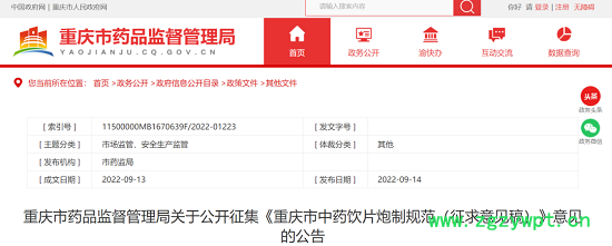 9月14日,重庆市药监局公开征集《重庆市中药饮片炮制规范(征求意见稿)》意见的公告,第一批107个品规,2022年10月13日前通过电子邮件反馈我局(附相关说明及实验数据、联系人姓名、联系方式等信息)。