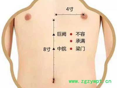 中脘穴:位于任脉,肚脐上四寸。