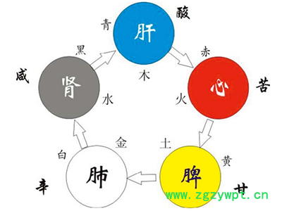 中医五行理论在中医理论形成发展中有着重要作用,其中五行对应五色,五色即青、赤、黄、白、黑五种颜色,五色与五行、五脏相对应,如《内经·阴阳应象大论》记载:“东方生风,风生木……在脏为肝,在色为苍……”