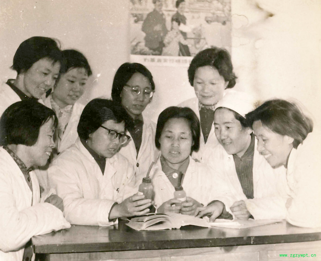 1976年,何成瑶(前排左三)在贵阳中医学院第一附属医院与同事进行业务讨论。