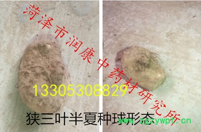 我国野生半夏品系,单从叶型上可分为竹叶型、似竹叶型、柳叶型、桃叶型、狭三叶(菏泽市润康中药材研究所(山东)选育并命名)、杏叶型、芍药叶型、手掌叶型等13个品系;其在各地区分布大约是:竹叶型、芍药叶型、杏叶型分布较广,在全国半夏野生主产地均有发现;似竹叶型、手掌叶型分布在贵州、云南、四川、湖南、江西等省的长江流域和部分地区;“狭三叶”半夏也就是桃叶型半夏选育型,主要原产地山东菏泽及周边。根据山东菏泽市润康中药材研究所从事二十多年半夏种植的田间实践观察,从以上半夏不同叶型中比较筛选,其中以山东菏泽和江苏丰县原产地的“狭三叶”半夏产量高,质量好,其长势旺盛,茎叶分蘖多,光合作用和抗性较强,高抗腐烂病和高温枯萎倒苗;珠芽形成的早而大,商品个体大且圆整,可作为半夏种植的良种,也是目前人工半夏种植的优良品系。