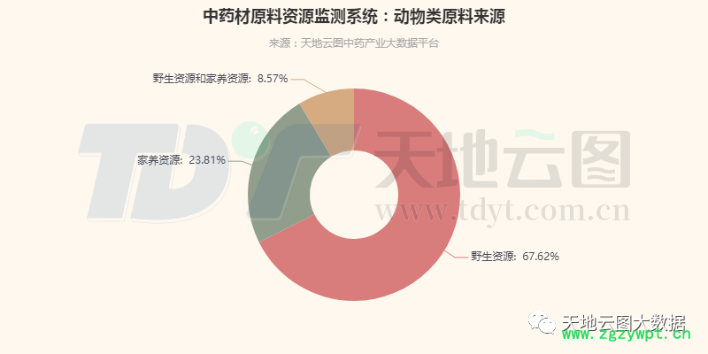 从供给来源看:野生资源供给占比偏高。在天地云图中药产业大数据中心监控的2650个品种(包括相同品种不同品规不同产地)中,动物类中药材有105种。其中,原料主要来源于野生资源的有蛤蚧、海螵蛸、石决明、蜈蚣、乌梢蛇、蝉蜕、桑螵蛸等71种,占比67.62%;主要来源于家养资源的有僵蚕、蚕茧、蚕蛹、阿胶、五谷虫等25种,占比23.81%;野生资源和家养资源均有供应的有鱼鳔、珍珠母、蜂蜡、珍珠、麝香、牛黄、龟甲等9种,占比8.57%。